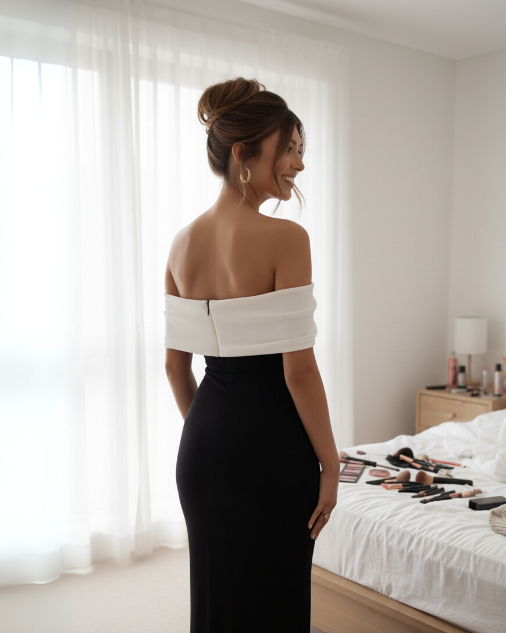 This dress creates a perfect harmony between black and white. The top features a folded white band that sits off the shoulder, acting like a spotlight that frames your face and highlights your collarbones.